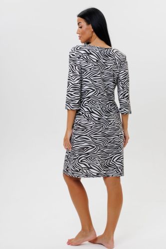 Ночная сорочка с анималистическим принтом сшита из вискозного полотна. У сорочки V-образный вырез, отделанный кружевом. Длина чуть выше колен. Рукава 3/4.