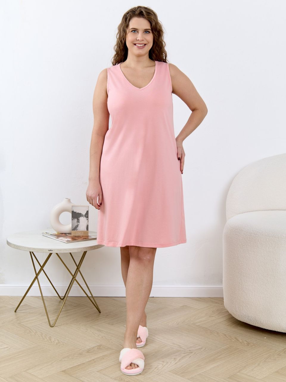 Сорочка женская из гладкокрашенного трикотажного полотна «кулирка», слегка расширенная книзу, без рукавов, с горловиной V-образной формы, окантованной основным материалом. Проймы и горловина обработаны декоративной строчкой «кроше».