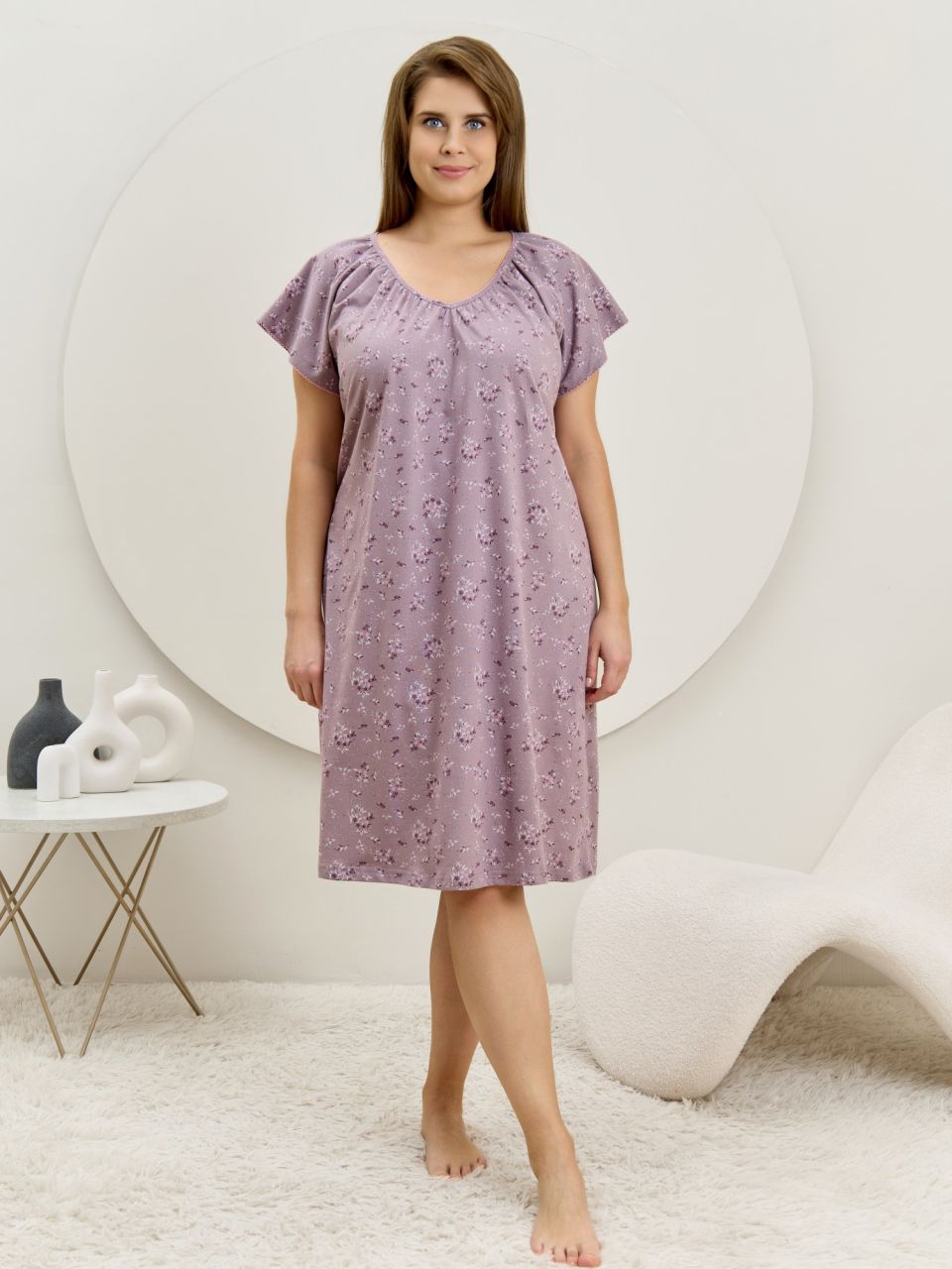 Сорочка женская из трикотажного полотна «кулирка» с набивным рисунком свободного покроя, с короткими втачными рукавами покроя «реглан». Углубленная горловина V- образной формы, собрана по краю на сборку и окантована основным материалом. Низ изделия и нижние срезы рукавов обработаны узким обметочным швом нитками в тон изделия.