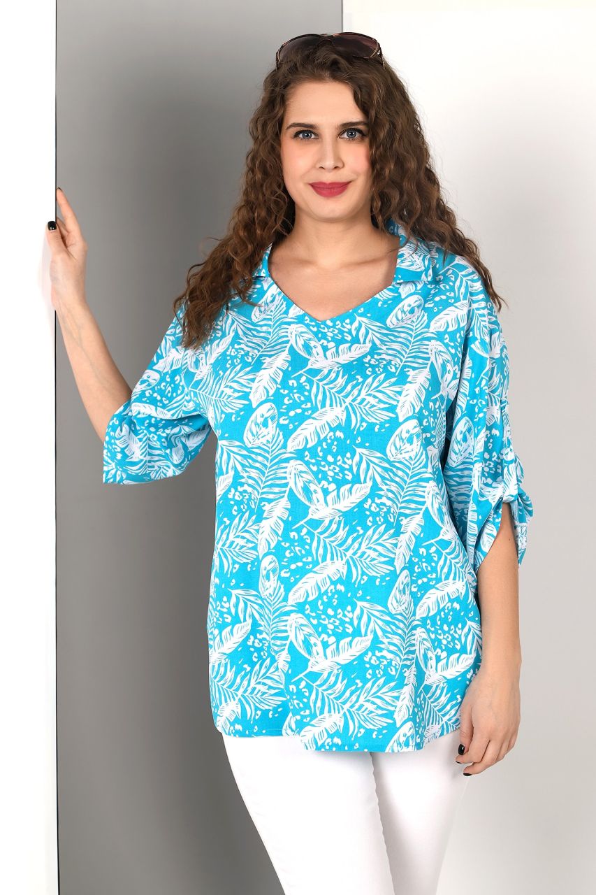 Туника женская из тканого штапельного полотна с набивным рисунком, стояче-отложным воротником, без застежки, фигурным низом, горловиной v-образной формы, втачными рукавами длиной ¾, задрапированными при помощи пат с пуговицами.