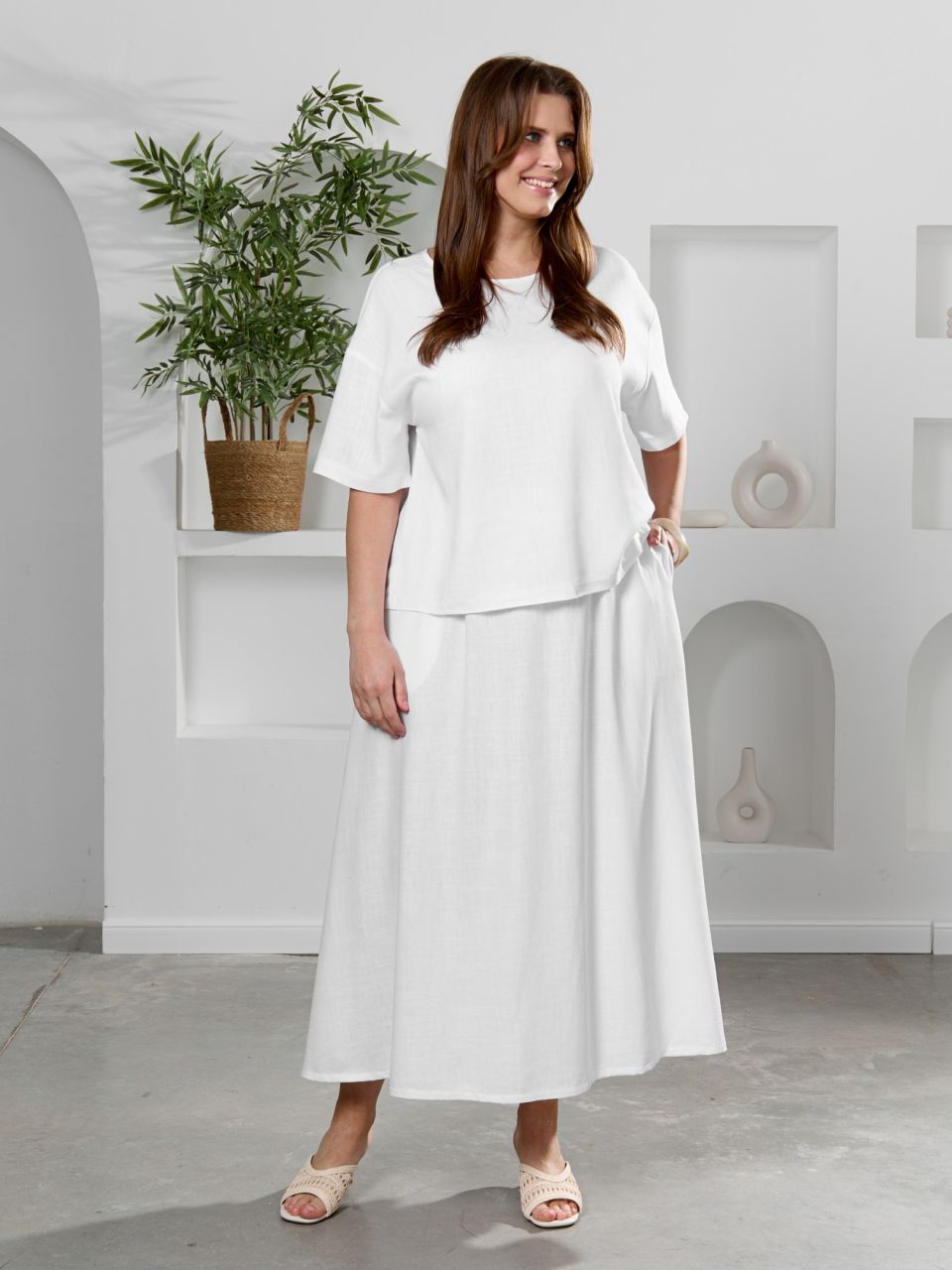 Юбка женская из гладкокрашеного тканого полотна, удлиненная, свободная, с карманами в боковых швах, на притачном поясе с эластичной тесьмой внутри.