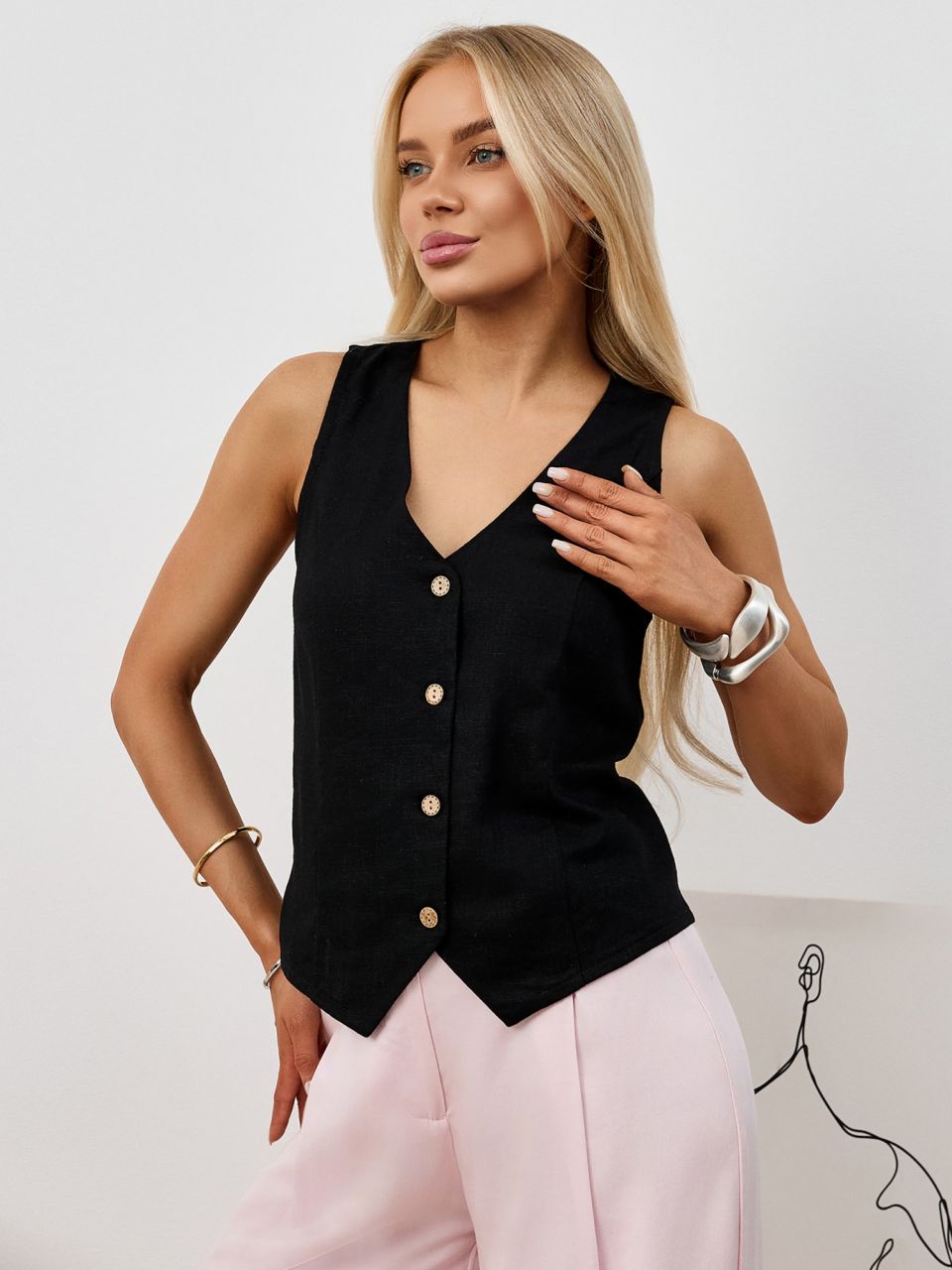 Жилет молодежный из плательной ткани "лен-вискоза" полуприлегающего силуэта с рельефными вытачками на полочке, рельефами на спинке для комфортной посадки по фигуре, без подкладки, с центральной бортовой застежкой на петли и пуговицы.